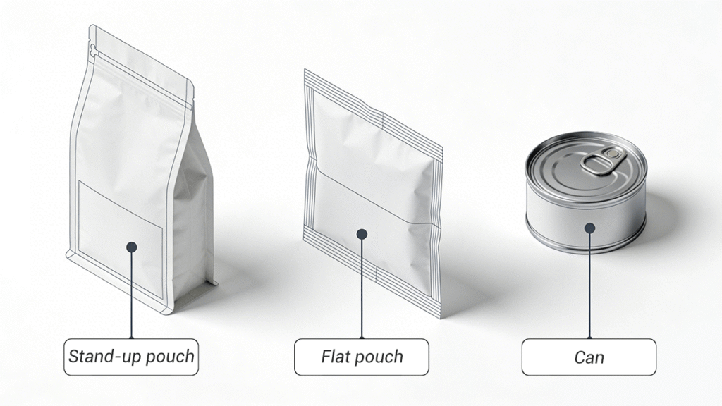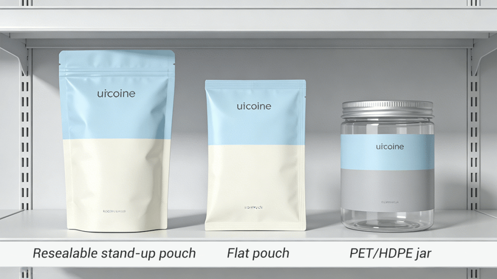 Effective packaging must balance visual appeal, clarity, emotional connection, and compliance transparency. Popular formats include stand-up pouches (resealable, high-barrier), flat pouches for value SKUs, and rigid PET/HDPE jars for premium lines.