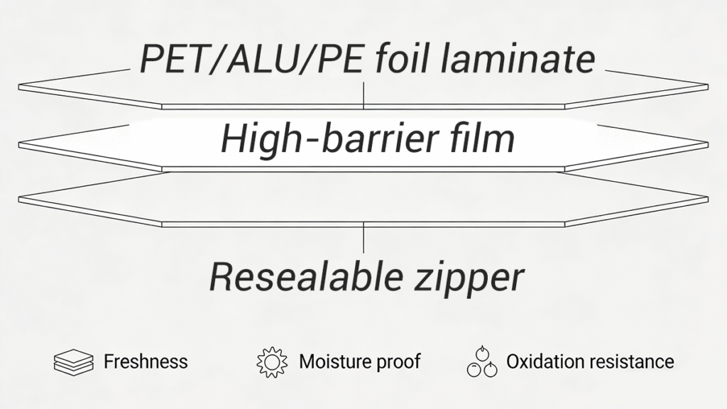 Food safety is non-negotiable. Proper packaging prevents oxidation, moisture damage, and contamination. Recommended structures include PET/PE laminations, PET/ALU/PE foil laminates for long shelf life, BOPA puncture-resistant laminations, and BOPP labels for rigid containers.