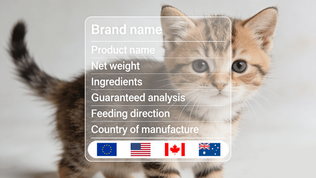U.S. packaging must comply with FDA regulations and follow AAFCO labeling guidelines. Mandatory elements include brand name, product identity, net quantity, guaranteed analysis, ingredient list (descending weight), feeding directions, manufacturer statement, and lot/date codes.