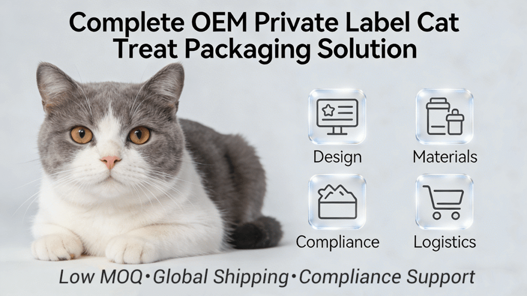 High-quality private label cat treat packaging combines strategic design, food safety, regulatory compliance, brand personalization, and cost optimization. Partnering with an experienced OEM reduces risk and accelerates market launch.
