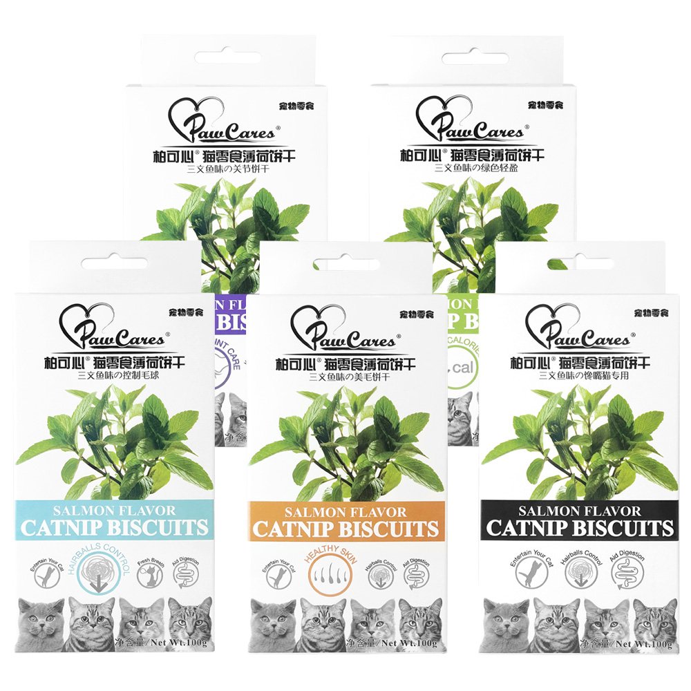 | Key Ingredients | Wheat Flour, Palm Oil, Sugar, Salmon Paste, Catnip, Shrimp Shell Meal, Sodium Bicarbonate | Wheat Flour, Palm Oil, Sugar, Salmon Paste, Catnip, Shrimp Shell Meal, Sodium Bicarbonate, Green Tea Powder, L-Carnitine | Wheat Flour, Palm Oil, Sugar, Salmon Paste, Catnip, Shrimp Shell Meal, Sodium Bicarbonate, Chondroitin Sulfate, Mixed Tocopherols | Wheat Flour, Palm Oil, Sugar, Salmon Paste, Catnip, Shrimp Shell Meal, Sodium Bicarbonate, Soybean Fiber, Fructooligosaccharides | Wheat Flour, Palm Oil, Sugar, Salmon Paste, Catnip, Shrimp Shell Meal, Sodium Bicarbonate, Flaxseed |
